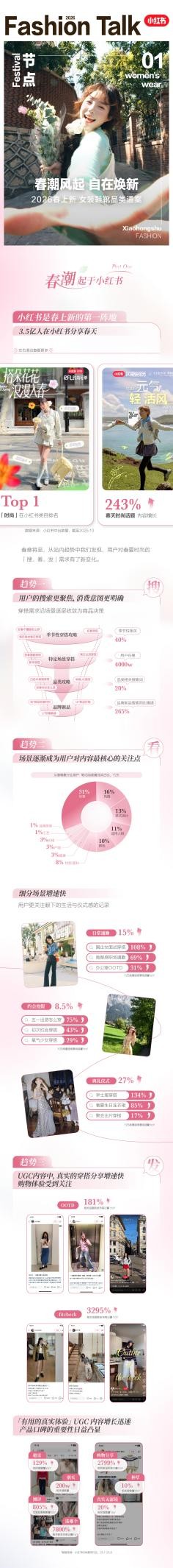 小红书聚集了大量生活方式人群,她们积极探索「找春天、看春天、分享春天」相关内容,构建出各类细分风格与生活场景,这些新趋势帮助女装品牌快速洞察市场审美风向标,找到契合人群的高效种草方法论。
